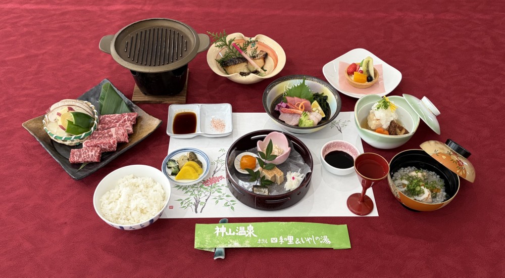 神山温泉自慢の神山の恵み山彩膳に、国産霜降り牛陶板焼を盛り込んだグルメプランです。
