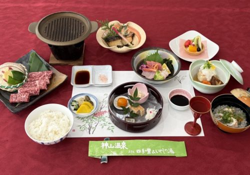 神山温泉自慢の神山の恵み山彩膳に、国産霜降り牛陶板焼を盛り込んだグルメプランです。ちょっと豪華に満喫したい場合にオススメです。