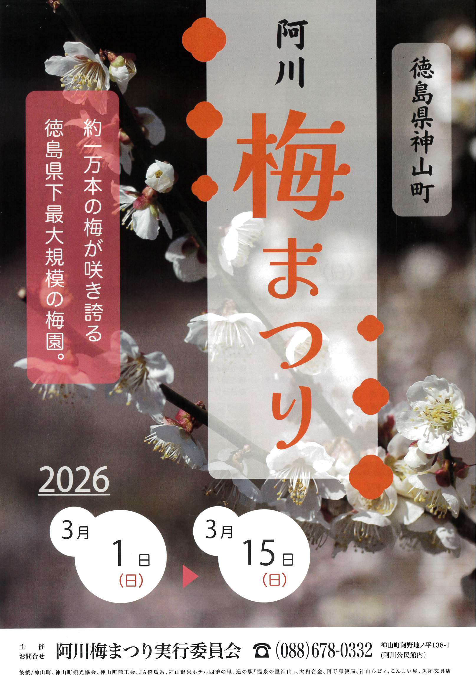 | 日程 | 2026年3月1日(日)~3月15日(日曜日) | 開催地 | 神山町阿野字二ノ宮 阿川梅の里周辺 |
